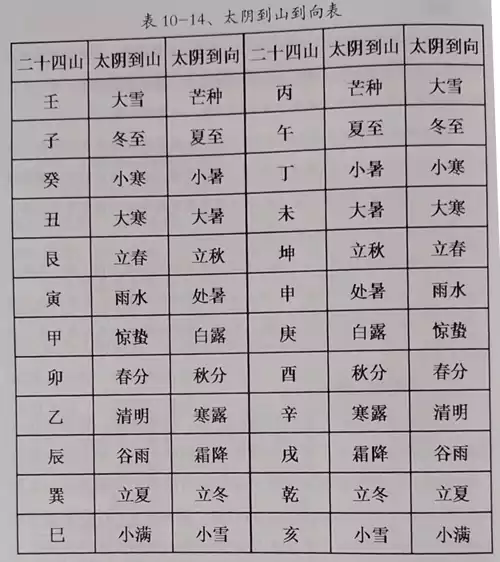 根据此表可以查出二十四山某节某气太阴到山到向。如查壬山:大雪太阴到壬山,芒种太阴到向。又如查丙山:芒种太阴到山,大雪太阴到向。